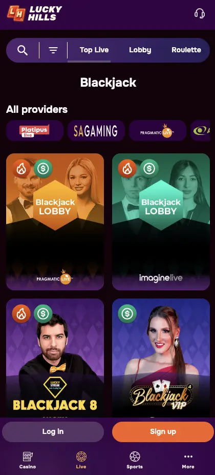 Our casino satisfies Australians’ gaming desires by providing quality games like VIP Blackjack. This is a live dealer title that high rollers love for its high bet limits for greater profits. We have over 200 tables that you can join. The casino provides different categories, including blackjack, roulette, baccarat, poker and game shows. Lucky Hills live casino games provided by prominent developers like Pragmatic Play Live and Vivo. Anyone can find a title that suits them because we cover different bet ranges and simple and difficult-level options.